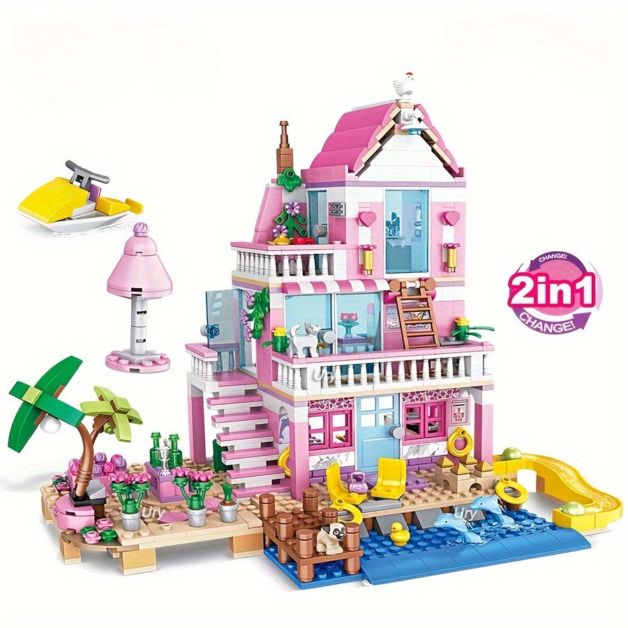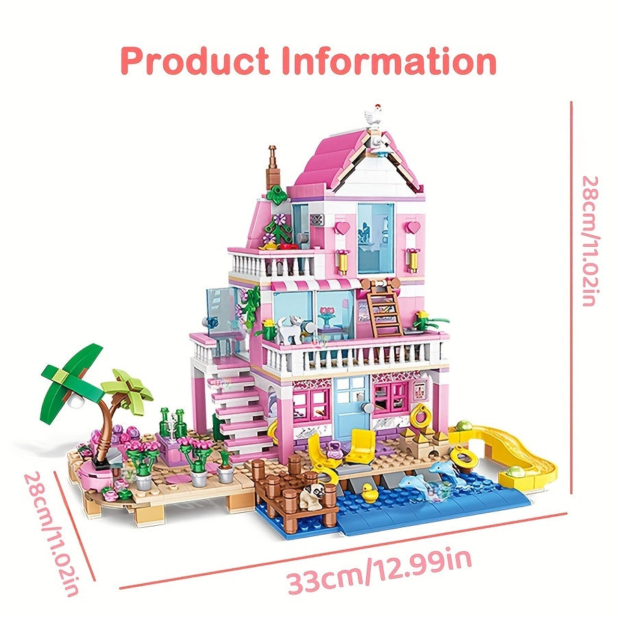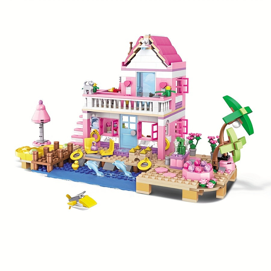 Une série de maisons et d'appartements de villa de plage d'été sur le thème de bons amis, d'architecture de blocs de construction, de scènes de rue, de jouets d'assemblage DIY, parfait pour des cadeaux d'anniversaire et de Noël.